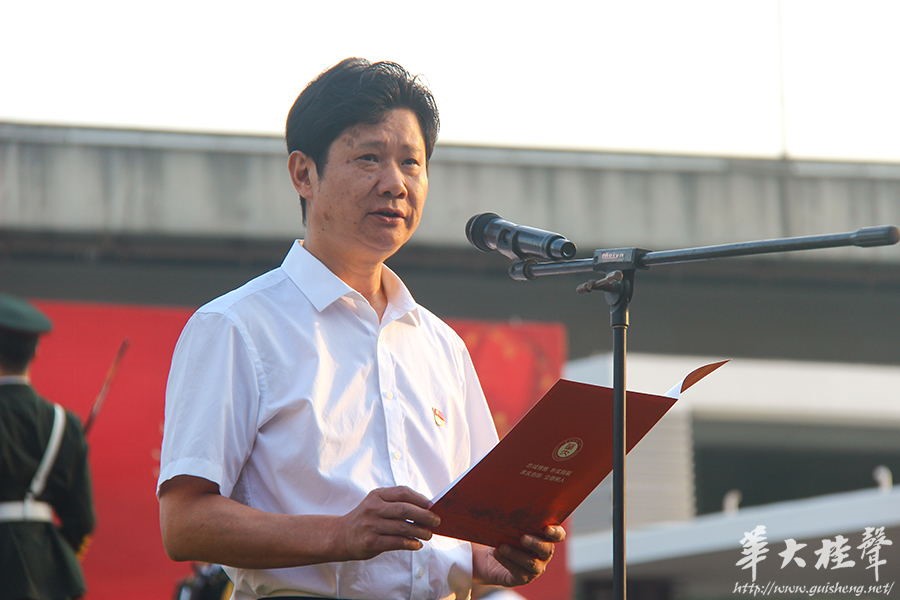 With the melodious school song, the school flag of CCNU raised slowly in the light of dawn. The national flag and the school flag both flew with the breeze. The flag-raising ceremony entered the second stage——review the Party oath. Under the leading of principal and deputy party secretary of our school Zhao Lingyun, all the party members present took oaths solemnly towards the party flag.