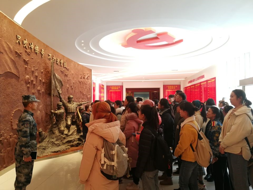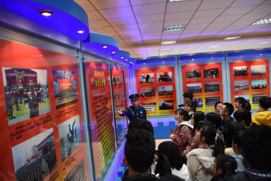 The first stop of the study tour is the honor room of Huang Jiguang. Interpretations of this admirable soldier were unfolded in three aspects: "hero's footprint and heroic deeds", " hero's company and descendants " as well as " flag of hero and his contributions “. All the students learned that from great past deeds of Huang Jiguang to the Huang Jiguang Company nowadays which has a fine style of work and strict discipline, heroic spirit is everlasting and Chinese soldiers still have a boiling passion. What strikes to our heart was the oath of the sixth company "iron general belief, iron general faith, iron general discipline and iron general responsibility"!