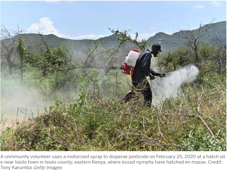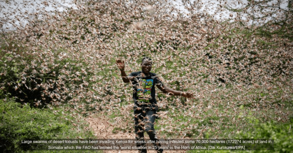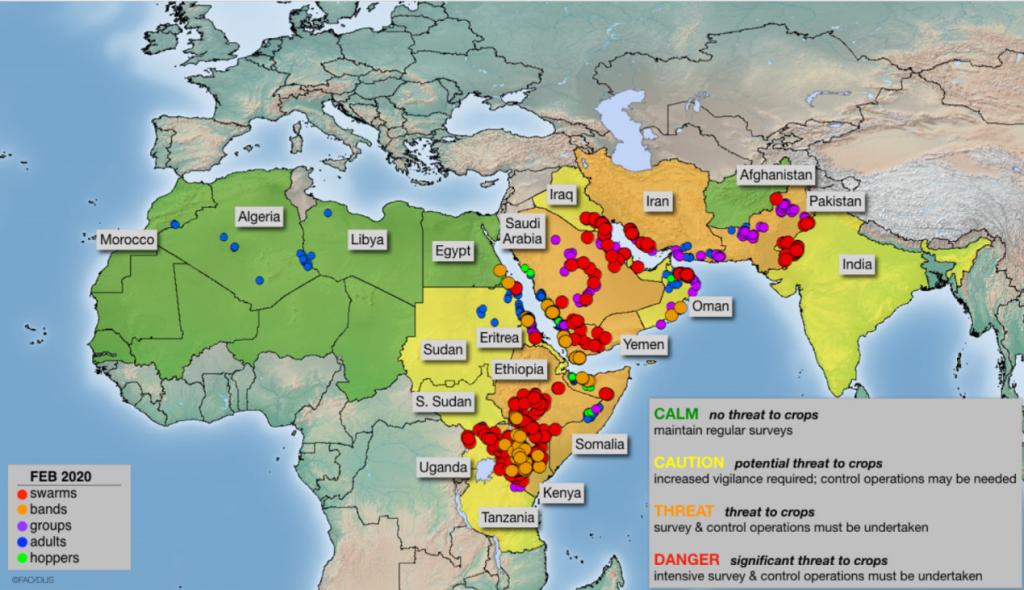 近几个月来,非洲东部多国遭受严重的沙漠蝗虫灾害。联合国粮农组织称,非洲地区的蝗虫正在不断繁殖,预计未来将继续形成新的蝗虫群,进一步加剧灾情。其中,埃塞俄比亚南部、肯尼亚北部和中部、索马里东北部地区受灾更为严重。此外,蝗虫群还在继续向非洲其他地区、甚至向西亚和南亚蔓延:与肯尼亚相邻的乌干达东北部地区、南苏丹东南部地区等发现了成熟的蝗虫群;巴基斯坦、印度遭受蝗虫群侵袭;接近4000亿只蝗虫正逼近中国边境。