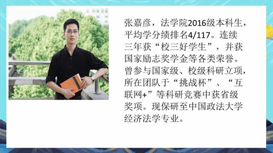 At the beginning of the meeting, Li Junxuan, the host, gave a brief introduction to the contents of the activity, and then the three sharers officially began to exchange their experience. Zhang Jiayan, a student who will major in economic law in China University of Political Science and Law through postgraduate recommendation, first shared his experience. Zhang Jiayan pointed out that the postgraduate entrance examination is actually an information war. For the students who are fighting in the battlefield, information is an important factor to determine the final victory. Therefore, the collection of information is very important for the students. In addition, Zhang Jiayan shared many kinds of information collection ways and interesting stories around him with the students. Then, he introduced four factors that need to be paid attention to in preparation of postgraduate entrance examination: scores, foreign languages, scientific research experience and competitions. He stressed that when choosing a major, one should not blindly follow the trend, but choose a major suitable for him. Besides, the students in the same school are not completely competitive, and everyone working together is a win-win situation. Finally, he also answered questions for students, introduced methods of participating in scientific researches and encouraged them to participate actively.