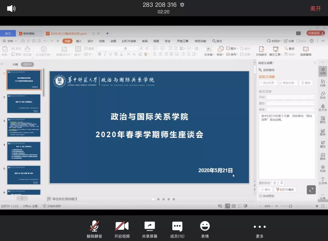 With the purpose of promoting the positive interaction between teachers and students and improving the education quality of the school, on the evening of May 21st, under the guidance of Undergraduate School, CCNU, the conversazione between teachers and students for the spring semester in 2020 held by School of Politics and International Relations(hereafter referred to as SPIR)went on smoothly on the platform Tencent Meeting. In this activity, Cheng Xiangzhang, the counsellor of Undergraduate School, was specially invited, with Professor Hu Zongshan, president of SPIR, Professor Huang Huixiang, the vice-president, Professor Zhao Changfeng, dean of International politics department, Professor Yuan Fangcheng, dean of politics department, associate Professor Qian Daogeng, Zhou Huaping and Zhao Ningning who served as representatives of teachers, and six students from different grades and majors engaged. Besides, the conversazione was hosted by Sun Yansong, the teaching secretary.