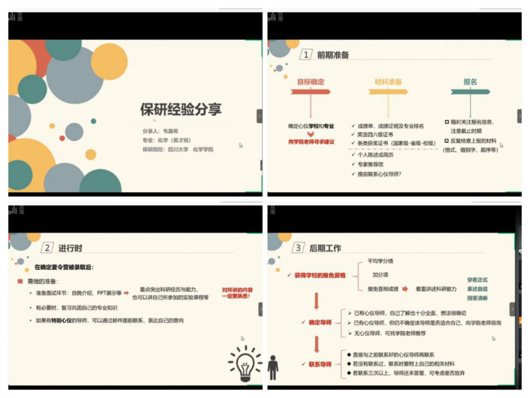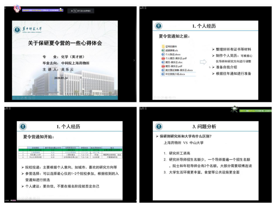 The last student was Wu Leyun, who was a student of the elite class of grade 2016 of the School of Chemistry. And now, she has been recommended into the Shanghai Institute of Material of Chinese Academy of Sciences (CAS). Starting with the experience of the postgraduate recommendation summer camp, she mainly talked about three aspects: the material preparation before the summer camp notice, the matters needing attention at the beginning of the notice and the key points during the interview. She encouraged the students of grade 2017 not to deny themselves form the very beginning and to be brave enough to sign up for the school they want. At the same time, she also shared her interview experience, emphasizing that students should make full preparations in advance, introducing with emphasis the scientific research training she received in university and keeping an optimistic and positive attitude when talking with teachers. Finally, she took Shanghai Institute of Materia Medica of Chinese Academy of Sciences and Sun Yat-sen University, which she was familiar with, as an example to make a comparison, and explained the differences between research institutes and universities to provide guidance for students of grade 2017.