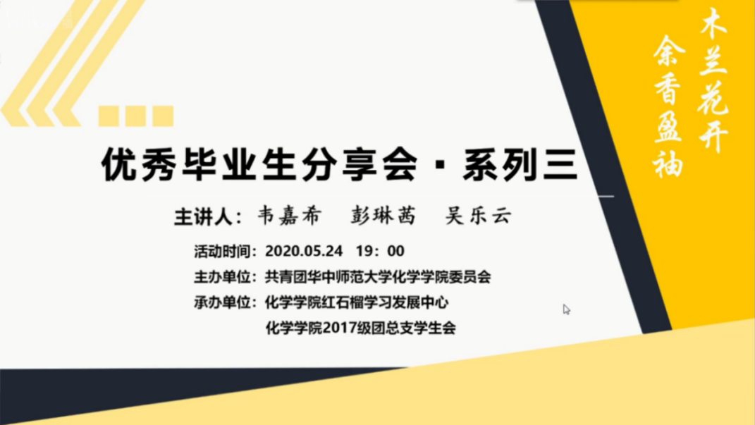 On the evening of May 24, a special rolling call and graduate sharing session (the third session) of the School of Chemistry was successfully held on the platform bilibili. This activity was sponsored by the committee of the Communist Youth League