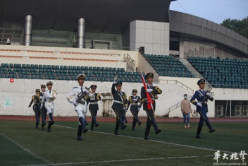 Then, the members of the national flag guards lined up again and crossed the avenue to Youming stadium. Along the way, they sang the song of Tian An Men national flag guard team. Arriving at the Youming stadium, they held a flag raising ceremony successfully. It was observed that several freshmen, who arrived at the playground early to wait for military training finding that the flag raising ceremony was in progress, went over and watched ceremony before leaving.