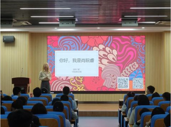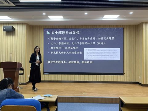 Later, Dai Xinyu from the Chinese class shared her thoughts. She called herself an "also-ran of the National Award." She mentioned six aspects in her speech from "adapting to campus life" to "mental adjustment". When it came to the section of professional learning, Dai Xinyu classified the subjects, carefully, analyzed the learning methods, and especially emphasized the significance of learning to organize the files. She explained questions like "how to balance the student work" and "the advantages of tutorial system" based on her own experiences. Through her explanation, students harvested the meaningful perceptions and experience directly.