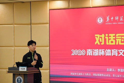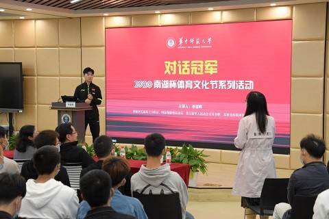 The Voice of CCNU At 4am. on October 28th, the first "Communicate with the Champion" activity of Nanhu Cup Sports Culture Festival was held in the 9115 conference room of Nanhu complex building. This activity was sponsored by the Student Affairs Department of the Party committee of CCNU and undertaken by the School of Physical Education and Sports of CCNU. Li Yinhui, a graduate from School of Physical Education and Sports of CCNU and champion of “Nanhu Cup” mixed group competition, was the keynote speaker of the event. Han Junhua, head of the Student Affairs Department of the Party committee of CCNU; Guo Qing, secretary of the Party committee of the Institute of physical education and Deputy Secretary of the Party committee of the Institute of physical education, attended the event nobly. Han Junhua was the host of this activity.