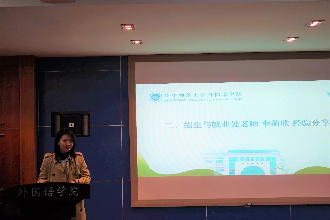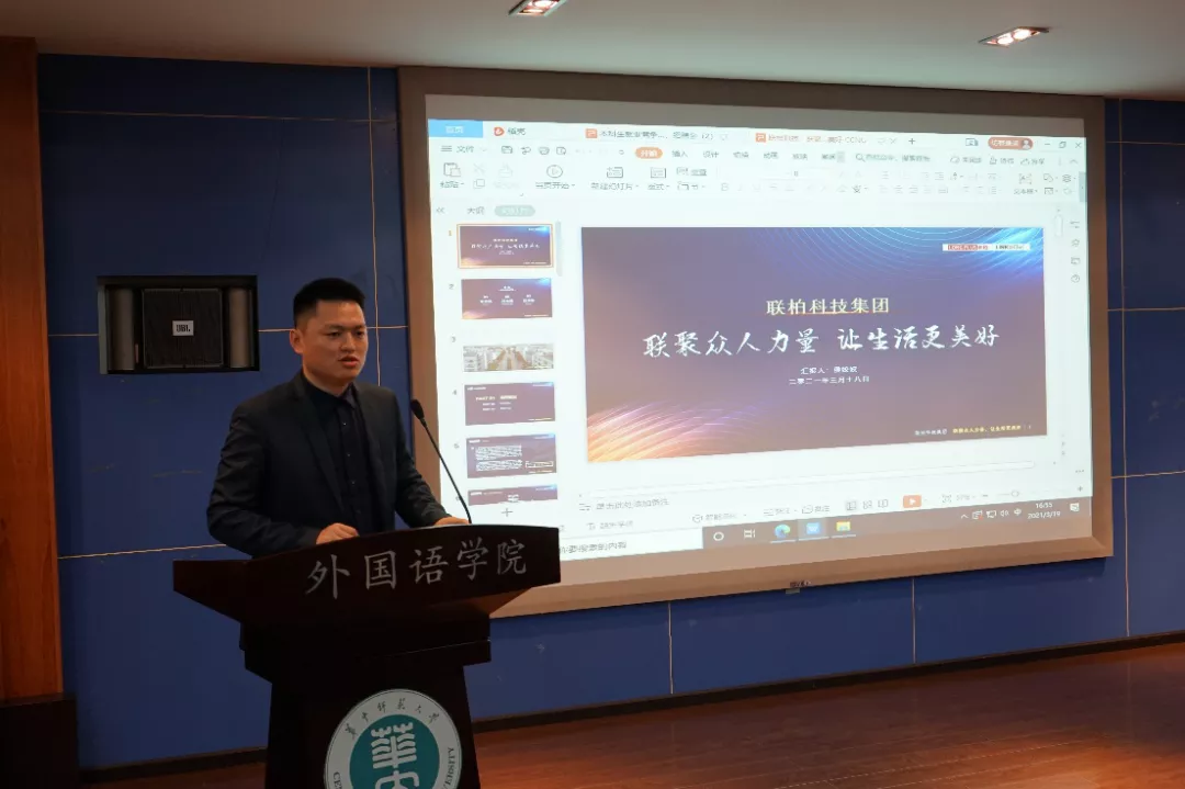 In order to enhance the employment competitiveness of undergraduate students, help foreign language graduates find the right direction of employment and make clear their life plans, the school of foreign languages held a forum and a special recruitment fair for alumni and famous enterprises in classroom 3504 on March 19. Chen Wu, vice President of Guangdong Lianbai Technology Group; Hou Jiaojiao, marketing director of Overseas Marketing Department of Guangdong Lianbai Technology Group and 2001 grade fellow of Russian Department of our School; Li Mengxin, director of Enrollment Office of CCNU and 2001 grade fellow of Russian Department of our School; Li Yun, Secretary of Party committee of our School; Yang Lingzhen, deputy Secretary of Party committee; Pan Shuguang, deputy director of Russian Department and 2017 grade head teacher of Russian Department; Zhou Lijiang, 2020 grade head teacher of Russian Department, and 2017 and 2018 students majoring in small languages attended the recruitment fair. This lecture was presided over by counselor Pan Yingzi.