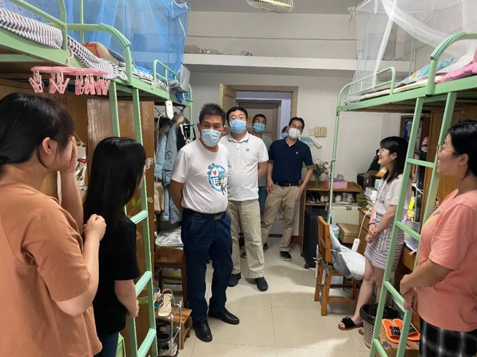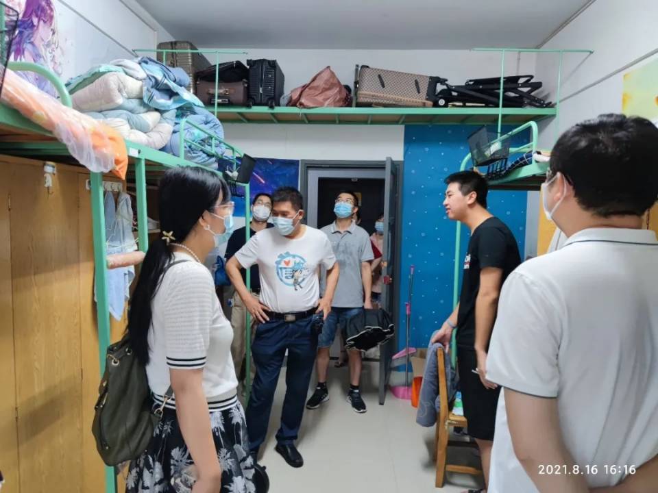 In the summer of 2021, there was an epidemic in some parts of China, and the situation of epidemic prevention and control was more severe. The university comprehensively strengthened the measures of epidemic prevention and control, and the School of Information Management was always concerned about the 172 students who stayed in school. On August 16, 2021, Wang Yulu, Secretary of the Party Committee of the School of Information Management, Li Yuhai, Dean and Deputy Secretary of the Party Committee, Wang Tao, Deputy Secretary of the Party Committee, Lu Xinyuan, Vice President of the School, and Li Jing, Jiang Keming, and Lu Wang, counselors of undergraduate and graduate students, visited the dormitories of the students staying in the school and observed the living conditions of students staying in the school, bringing warmth and care to students.