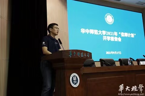 The Voice of CCNU On the morning of 17 September, the launching report of the “Excellent Teachers Cultivation Plan”project took place in the scientific conference hall. This project aimed to cultivate teachers with high capabilities for the developing regions of central and western of China, which is the latest measurement to motivate the education business of these areas. The participants of this meeting included the vice-principal of CCNU Peng Shuangjie, the secretary of the party committee of College of Physical Science and Technology Zhang Mingsheng and 5 instructors from different schools. Besides, a physic teacher from the Wuhan Xinsi province 4th Middle School, Yin Qibing, made a statement as a guest, which was for all the admitted freshmen. This event was hosted by Li Diao, the minister of the student affair department.