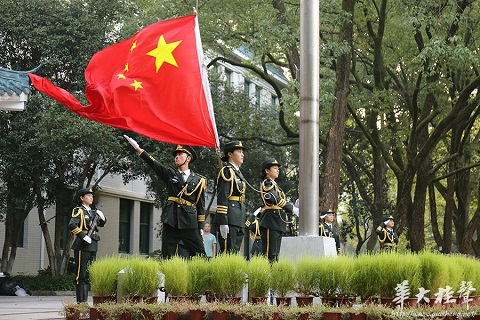 The Voice of CCNU On 7 a.m., October, 1st, in the dim light of the dawn, a national-raising ceremony was held with severe and solemness at Boone Library. Zhao Linyun, secretary of the Party Committee of the university, Hao Fanghua, the head teacher, and Peng Shuangjie, the vice principal, all attended the ceremony. Students lined up in a neat queue, full of enthusiasm with the Five-starred Red Flags waving in their hands against the wind.