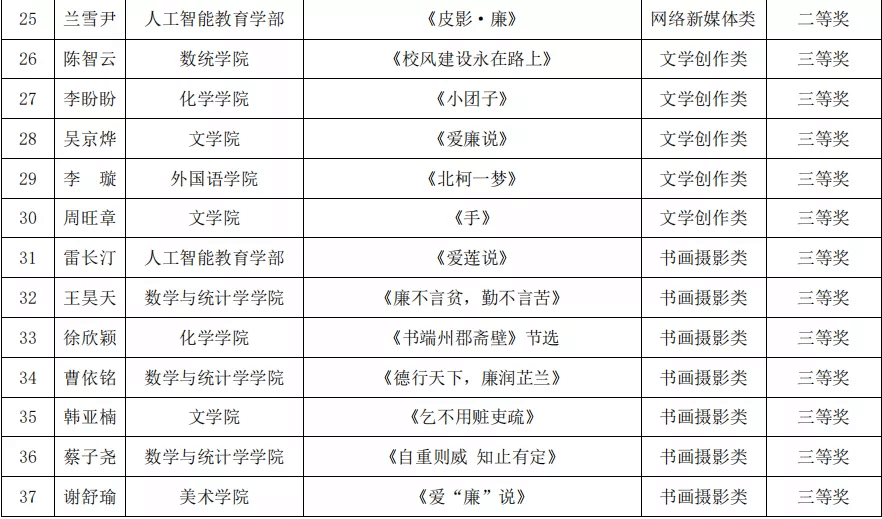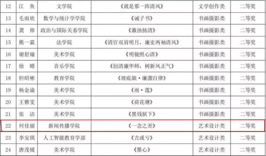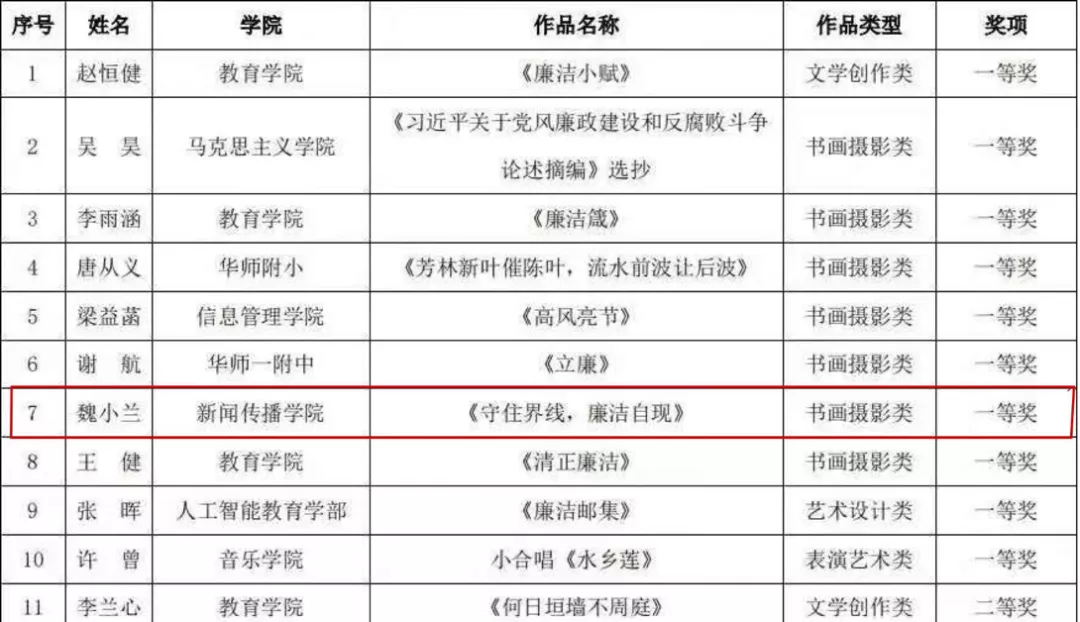 On November 1, the 2021 activity of collecting works on incorruptible culture of CCNU with the theme of "Create the Incorruptible CCNU, Build the New Atmosphere" announced its selection results. The activity was organized by the Discipline Inspection Commission Office of CCNU in conjunction with the Party Committee Propaganda Department, the School League Committee of CCNU and the experts of Labor Union of CCNU. The works of Wei Xiaolan and He Jiali achieved good results. Wei Xiaolan's calligraphy, painting and photography work “keep the Boundaries, Integrity Comes Naturally” won the first prize, and He Jiali's art and design work “the Momentary Slip” won the second prize.