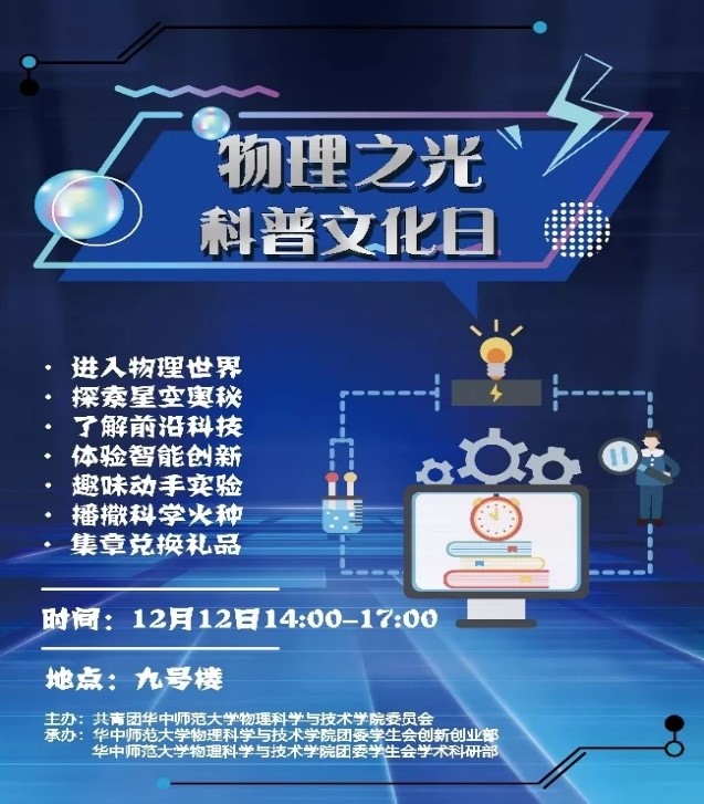 On the afternoon of December 12, science popularizing culture day activity in 2021 named “light of physics”,hosted by the Youth League Committee and the student union of the College of Physical Science and Technology of CCNU, was held in front of Building 9. With the theme of “free scientific imagination, innovation for pursuing dreams”, the activity aimed to make more students understand knowledge and ideas concerning physics, enhance students’ innovative consciousness and improve students’ practical ability.