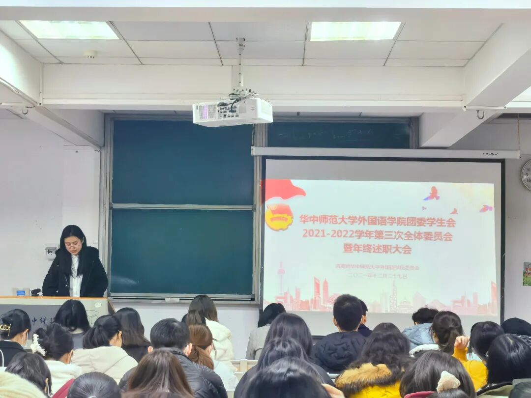 To promote the smooth running of the work of the Student Council of the College of Foreign Languages and to enhance the campers' sense of participation and recognition of student work, the third plenary committee and year-end report conference of the Student Council of the College of Foreign Languages of CCNU for the academic year 2021–2022 was held in classroom 3218 at noon on December 27th. Yang Lingzhen, Deputy Secretary of the College of Foreign Languages' Party Committee; Niu Jing, Secretary of the College of Foreign Languages' Youth League Committee; Qiu Ling, English Department Counselor of the Class of 2019, Cheng Wen, Minor Language Counselor of the Class of 2019, Wang Li, English Department Counselor of the Class of 2021, and Xu Yuan, Minor Language Counselor of the Class of 2021 attended the conference. The conference was hosted by Liu Ruirui, the office director.