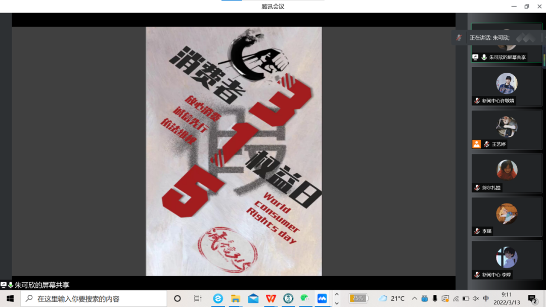 For the beginning part, Zhu led us into taking a brief look at guests and related processes. Next, the presentation of promotion products was officially unveiled. Among all those works, a video called “Carrot Fantasy” told a story about Xiao Hu’s experience. He wanted to buy Shuey Rhon Rhon, the 2022 mascot of the Paralympic Games in Beijing, but only find himself being deceived. That warned us to be alert to the online shopping scam and be aware to use legislation weapons to safeguard legitimate interests. A stunning poster designed by the anti-fraud team was shown to call for deviating from the action of damaging consumer interests before it started. The slogan was resounding-“safe consumption, honest first, law-abiding business”. The No.7 presenter used comic strips to illustrate a story where unscrupulous merchants made pancakes with gutter oil, ultimately being exposed and thus punished. She appealed to consumers that, “it’s our right and obligation to anti-fraud. All the consumers are supposed to be brave!” the team of Dongjiu 605 mixed their contents about anti-fake, protecting consumer rights and interests with some plots in Betty Sun, full of imposing fantasy and creativity. Besides, some took a wide variety of forms, such as gif posters, handwritten posters, to promotion of protecting consumer rights and interests.
