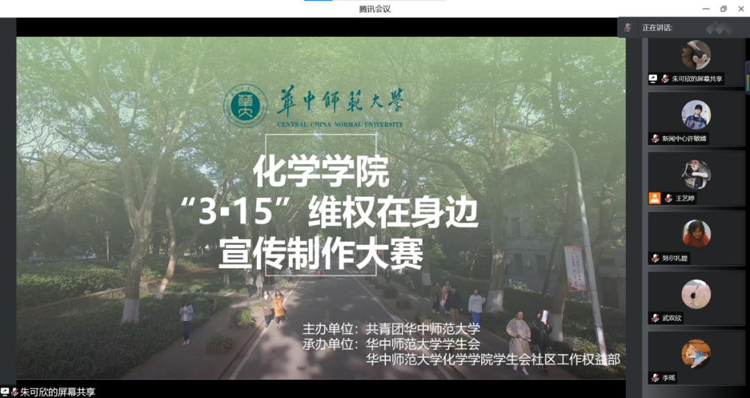 On March 13, the college of Chemistry held the online competition of “’3.15’ protecting the rights in the mundane”. This event was hosted by the Students’ Association of CCNU, organized by the Ministry of Community Work Rights of Students’ Association of CCNU. Guests comprised Ma Ying, secretary of the Communist Youth League of the college of Chemistry, Wu Shuangxin, deputy secretary of the youth league committee. Hu Yuqi, bureau member of the College of Chemistry, and Zhang Limei, head of Investigation and Monitoring Committee. Zhu Kexin was named as the hostess of this event.