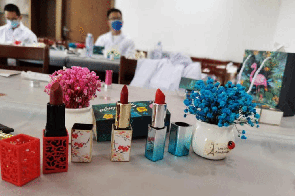 First, participants chose their favorite mouth red powder, poured it into sweet almond oil and stirred it evenly, then added white beeswax and small tree wax in turn, heated and stirred it, and finally added VE1 and essence and poured it into the mold to cool and set it.