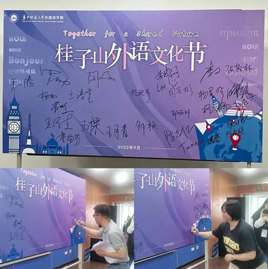 To popularize the knowledge of foreign language culture, creating foreign language studying atmosphere and build a solid foundation of broad international horizon and bright future, classroom 3504 of School of Foreign Languages observed the grand opening ceremony of foreign language culture festival in 2022 on the afternoon of September 25. Li Diao, Deputy Director of Office of Student Affairs of the Party Committee of Central China Normal University, Luo Lianggong, Dean of School of Foreign Languages, Cao Bin and Wang Jia, Vice Dean of School of Foreign Languages, Yang Lingzhen, Deputy Secretary of the Party Committee, He Juchun and Zhang Maolin from English Department, Yang Hong, Yang Chang, Pan Lei, Chen Zhihong, Tong Yangfen, Tan Ya, Yang Yuwan and Wang Jianyang, from College English Department, counselors Wu Bo and Zhang Ziyun, and other guests attended the opening ceremony. Niu Jing, Deputy Secretary of the Youth League Committee of the School of Foreign Languages, served as the host.