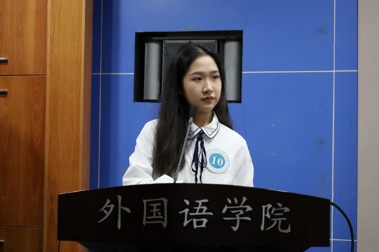 Later, Liang Sinao, a 2019 undergraduate from School of Foreign Languages, made a speech as the student representative. She said that since her admission in 2019, various professional competitions held by the academy have provided her with a development platform to stimulate her interest in language learning and expand her international vision. She also improved her English ability and strengthened her belief in language learning through these competitions. She hoped that more classmates will feel the charm of language, exercise their language ability and turn their interest in language learning into motivation in these rich activities.