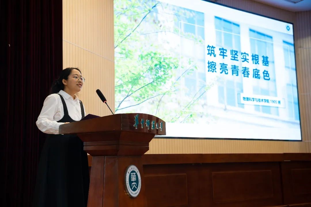 Yan Chunhui, a student representative of the Advanced Collective Award and Class 1905 of the College of Physical Science and Technology, from the three aspects of "learning", "teaching" and "behavior" described in detail the achievements of the class in learning activities, student work, practical activities of normal students and the cultivation of ideals and beliefs, and called on the students to "build a solid foundation and polish the youth background".
