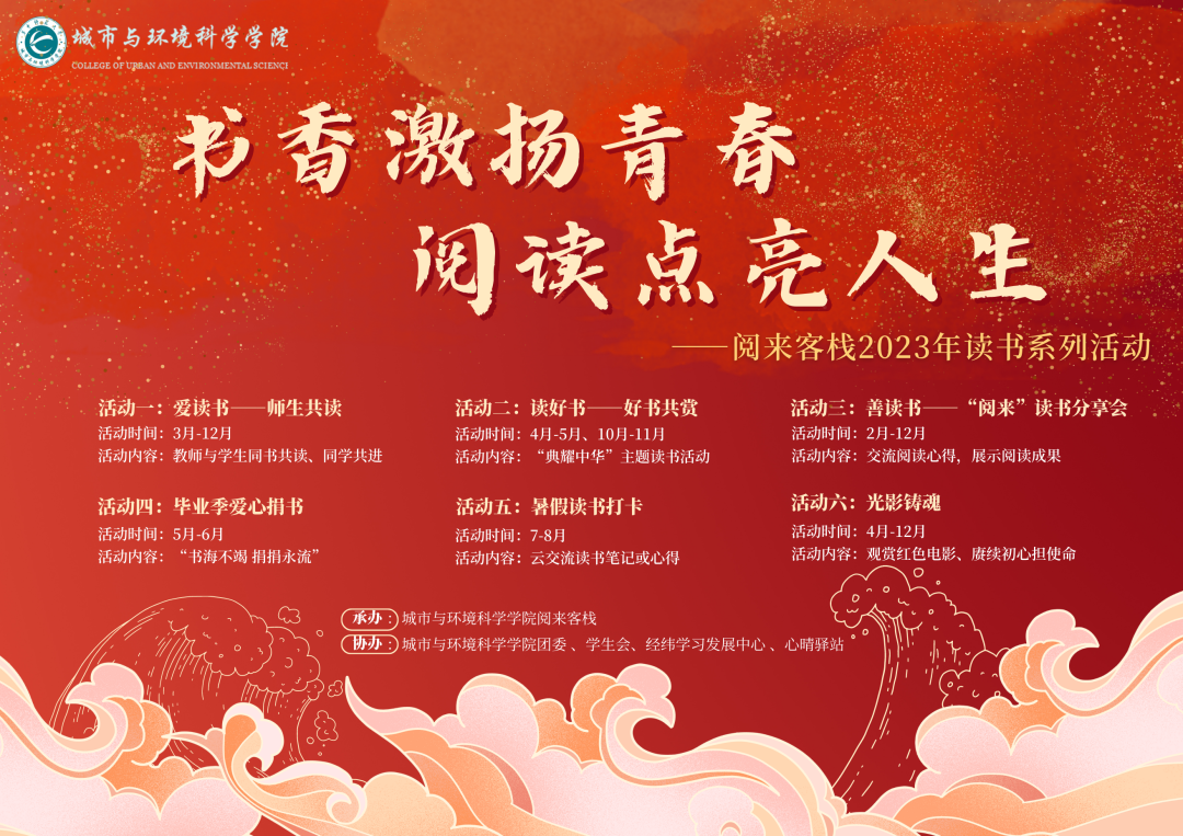 On March 28th, the National Youth Student Reading Action was officially launched. Recently, “Implementation Plan for the National Youth Student Reading Action” was issued by Ministry of Education and other eight departments, formulating detailed plans from enriching students’ reading content, innovating reading action carriers and improving long-term reading mechanisms. The Reading and Education Studio “Yuelai Inn” of College of Urban and Environmental Sciences launched a series of 2023 reading activities to create a good reading atmosphere, including “love reading, co-reading”, “reading good books ,sharing good books”, “good at reading, reading sharing meeting”, charitable donation of books during the season of graduation, reading books and punching cards in the summer vacation, and keeping original intention through reading red classics.