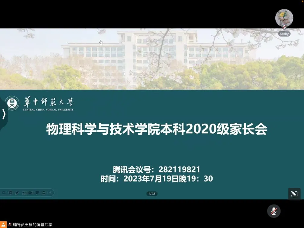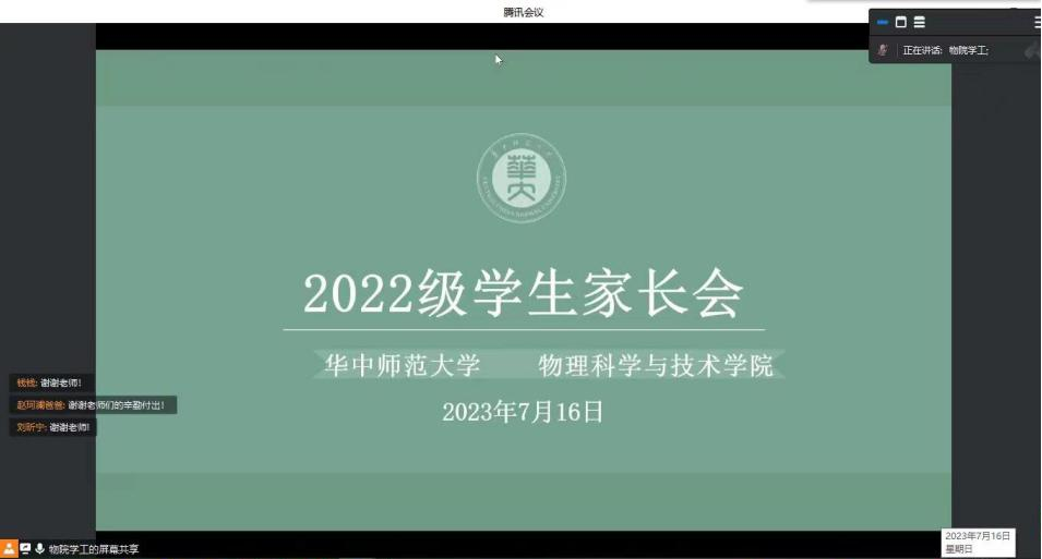 The Voice of CCNU From 15th to 19th July, the College of Physical Science and Technology held parent-teacher conferences for all grades of undergraduates through online meetings, which were attended by more than 1,000 parents of students. Parents' meetings were hosted by full-time counsellors of all grades. Wu Shaoping, Vice President of the College, and Ma Ying, Deputy Secretary of the Party Committee of the School, participated in the meetings and communicated with parents on the summary of the work of the semester and the outlook of the work of the next semester by grades. The parents' meeting had a good response among the parents of all grades, who generally believed that the meeting helped parents understand the work of the school and the college in a comprehensive and detailed way, and provided a direction for the next step of how parents play their roles, and how to promote the healthy development of students through the joint efforts of the school and the family.