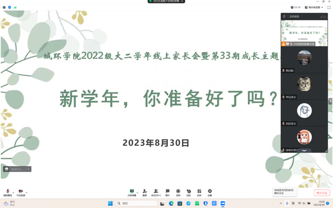 On the evening of August 31st, the meeting themed on "New School Year, Are You Ready?" was successfully held online. Counselor Lu Wen reviewed the adaptability education for freshmen carried out in the freshman academic year, provided a detailed introduction to the career support work carried out in different classes and majors, and made several suggestions for parents. Subsequently, a work report on grade cadres was conducted, and the vast majority of parents watched their presentation.