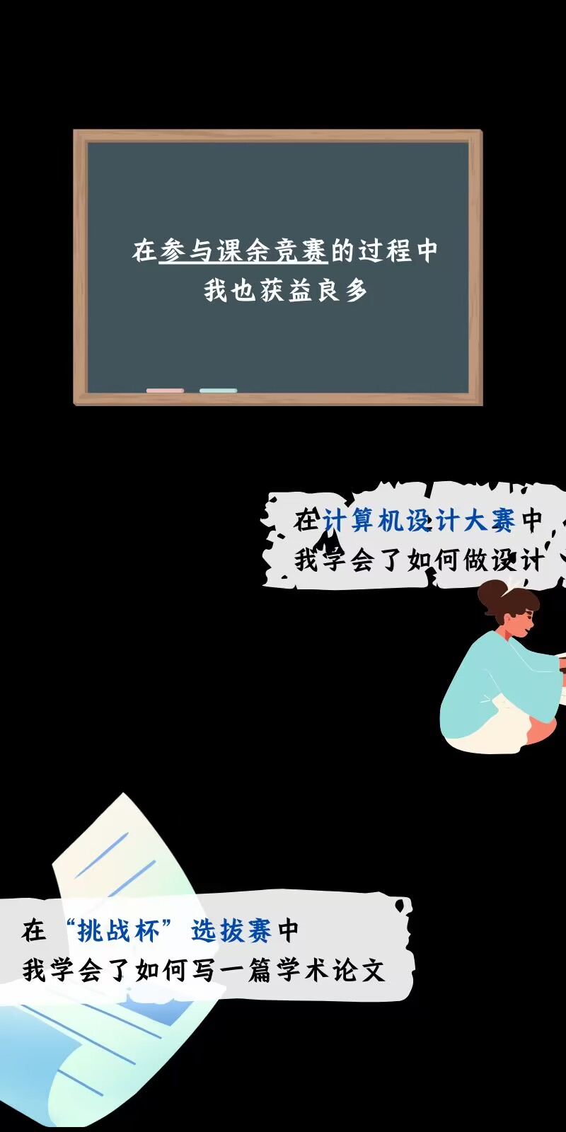 In the process of participating in the extracurricular competition, I also benefited a lot. In the computer design competition, I learned how to make designs. In the Challenge Cup tryouts, I learned how to write an academic paper.