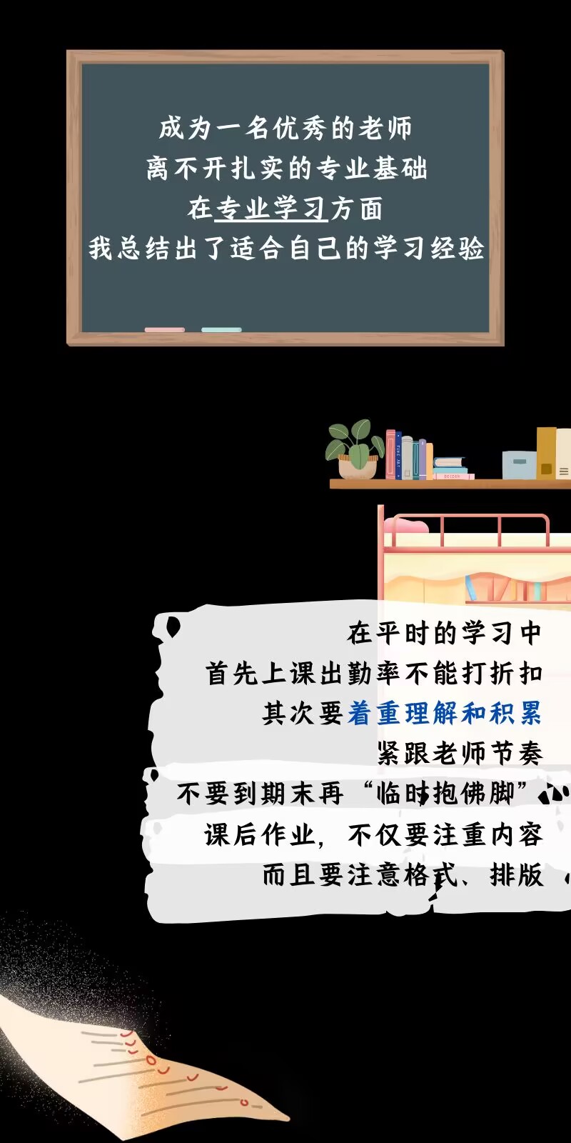 To be an excellent teacher, you must have a solid professional foundation. In terms of professional learning, I have summed up the learning experience suitable for myself. In the usual study, first of all, the class attendance can not be discounted, and secondly, we should focus on understanding and accumulation, keep up with the rhythm of the teacher, and do not "cram" to the end of the semester. Homework, we should not only pay attention to the content, but also pay attention to the format and layout.