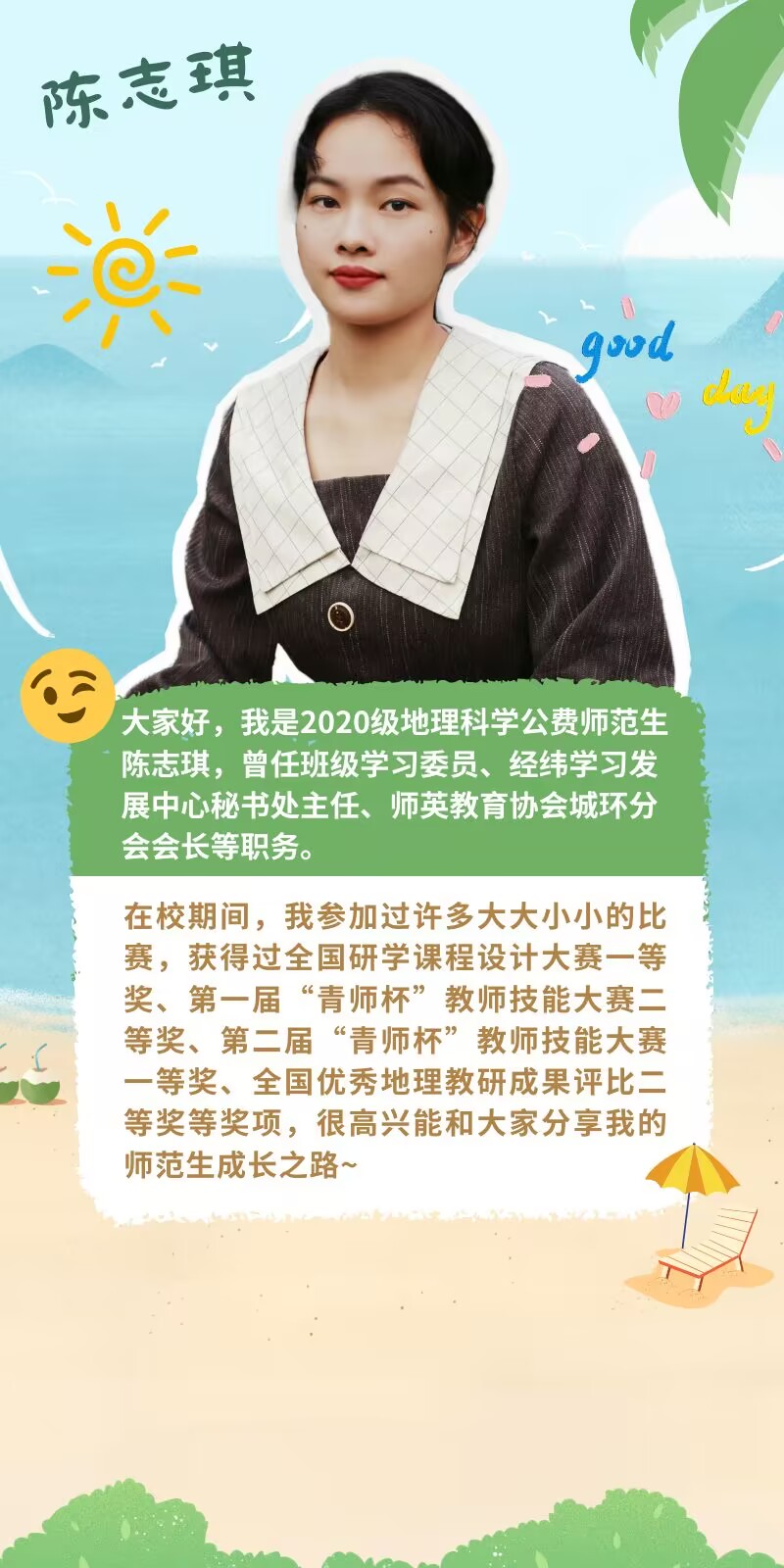 Hello, everyone. I am Chen Zhiqi, a state-funded normal student of Geography Science from Grade 2020. I have served as the commissary in charge of study in my class, the director of the Secretary Office of Jingwei Learning Development Center, and the president of the City Circle Branch of the Teachers' English Education Association.