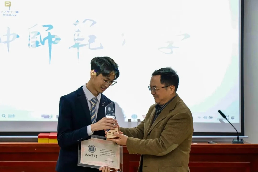 The fourth item of the ceremony was to recognize the award-winning individuals and groups. Jiang Zuosu presented the award to Lun Jiancong, while Xia Shouxin, Zhou Li, and Wan Yi and Chen Ke presented the award to Yang Jingwen and Yang Xinyu teams respectively.