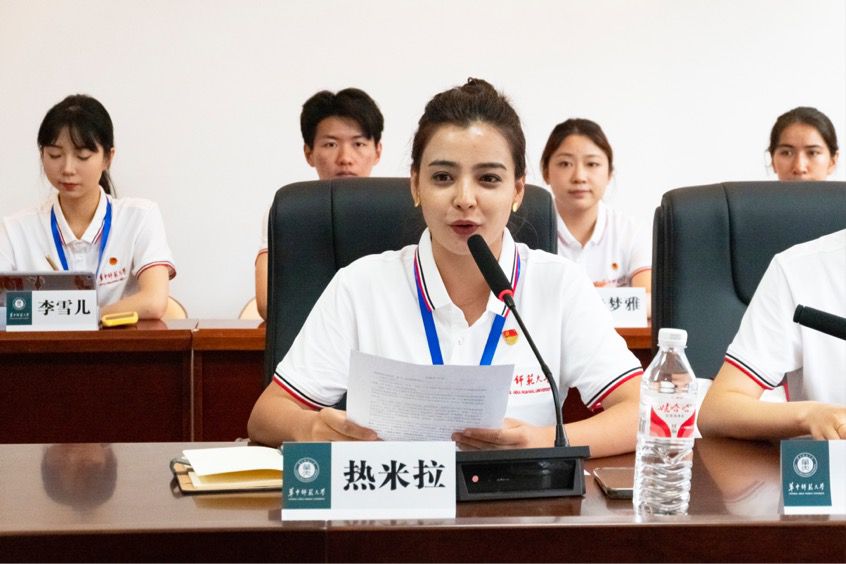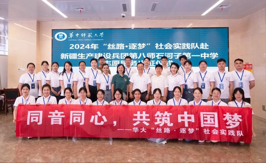 On June 27, the "Silk Road · Pursue Dreams" practice team of Central China Normal University went to Shihezi No. 1 Middle School of the Eighth Division of Xinjiang Production and Construction Corps for volunteer service and the ceremony was successfully held in Conference Room 203 of the College Student Activity Center. Yang Jun, director of the Department of Student Affairs of the Party Committee, Han Junhua, director of the Department of Student Affairs, Wu Jiancheng, deputy director of the Department of Student Affairs, all teachers of the Department of Ethnic Affairs and all members of the practice team participated. School beauty and common studio host, practice team lead teacher beauty day Guri hosted the activity.