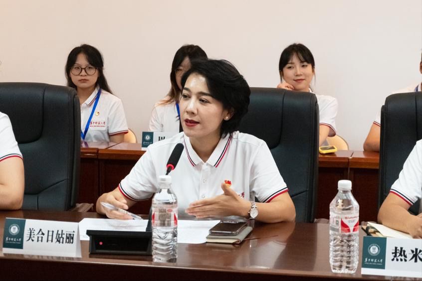 Practice team lead teacher Remila to make a brief report. After multiple rounds of selection, after comprehensive consideration by the National Unity and Progress Education Office of the Ministry of Education and Work, the school Meimei and the co-working Studio, 25 undergraduate and postgraduate students from 12 colleges covering 6 ethnic components were determined to form the social practice team. The team members carried out "ice-breaking group auxiliary", "entering Shihezi", "strengthening teachers' ethics and style", "classroom management art" and other theme training, and the whole team made adequate preparations for the trip to Xinjiang. Remira combined with practical work to practice members put forward several suggestions, encourage practice members in the social class to temper skills, youth to write on the land of the motherland.