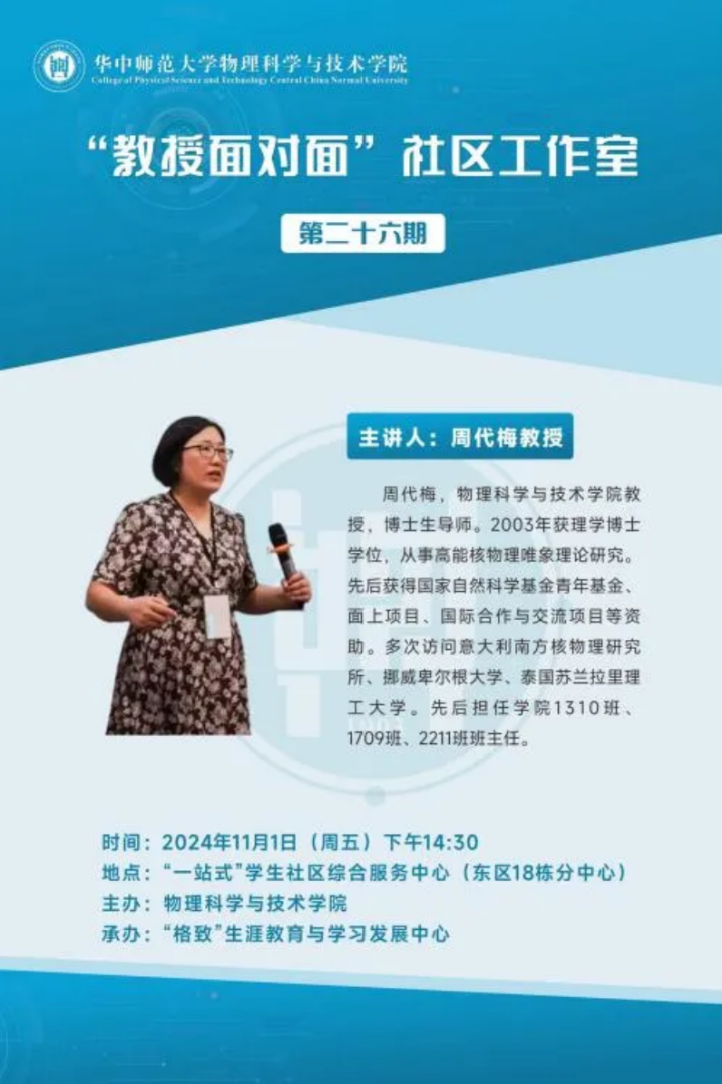 The Voice of CCNU On the afternoon of November 1st, the 26th community "Professors Face to Face" activity of the College of Physical Science and Technology was carried out in the community studio of Building 18 in the East District of the school. Professor Zhou Daimei and five freshmen of grade 24 had a special symposium on career education.
