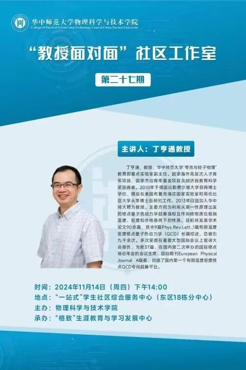 The Voice of CCNU On the afternoon of November 14th, the 27th session of the "Professors Face to Face" community event organized by College of Physical Science and Technology took place in the community studio of Building 18 in the eastern district of the university. Professor Ding Hengtong held a special seminar with five students from different grades.