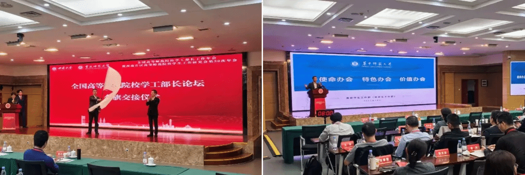 On the 23rd, the research delegation went to Chongqing Normal University to attend the National Forum of Directors of Student Affairs Departments of Higher Normal Universities 2025. A total of 219 student affairs cadres from 46 higher normal universities across the country participated in the conference, and in-depth policy interpretation, experience exchange and practical discussions were carried out around themes such as psychological education, financial aid-based education, cultural education, and the construction of "one-stop" student communities. A meeting flag handover ceremony was held at the conference, and Li Diao, Director of the Ideological and Political Education Division of the Student Affairs Department of the Party Committee, made a statement on behalf of the host institution of the next session of the National Forum of Directors of Student Affairs Departments of Higher Normal Universities. Director Li introduced the fine traditions and distinctive features of the school's ideological and political education work, and stated that relying on the advantages of the Training and Research Center for Ideological and Political Work Teams in Colleges and Universities of the Ministry of Education (The Central China Normal University) in training and research, theoretical research, practical exploration, policy consultation and other aspects, the school will adhere to hosting the forum with a sense of mission, distinctive features, and value orientation, and work in the same direction and achieve common development and prosperity with brother universities across the country.