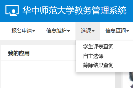 第一个学期,新生们的专业课都将由学校相关工作人员统一安排,因此同学们不用焦虑会有选不到课的情况,安心等待军训结束就好了。但计算机课和体育课是需要同学们自主选课的,选课的平台是华师的“教务管理系统”,(同学们可以登录“华师网上一站式服务门户”快速找到,网址:http://one.ccnu.edu.cn)选课遵循先到先得原则,因此新生们看准时机选课,显得尤为关键。