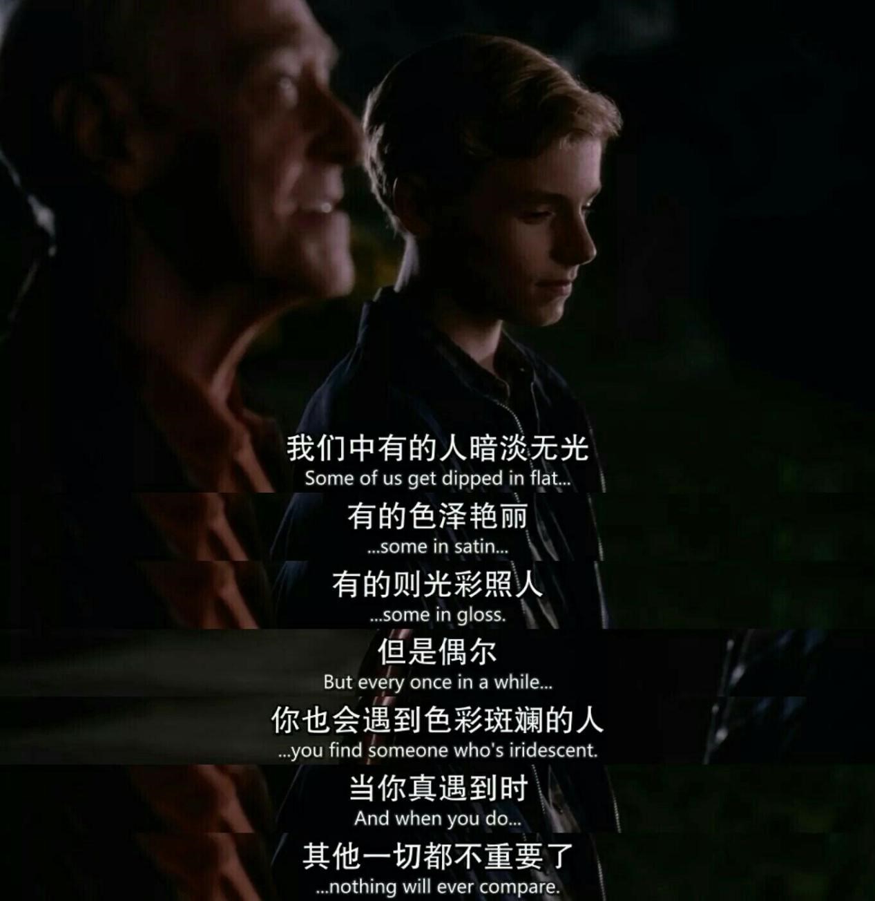 “我们生命中会遇到很多人,有的黯淡无光,有的色彩艳丽,有的光彩照人。但是偶尔,你也会遇到一个彩虹般绚丽的人。当你真的遇到,其他人就此变成匆匆浮云。”