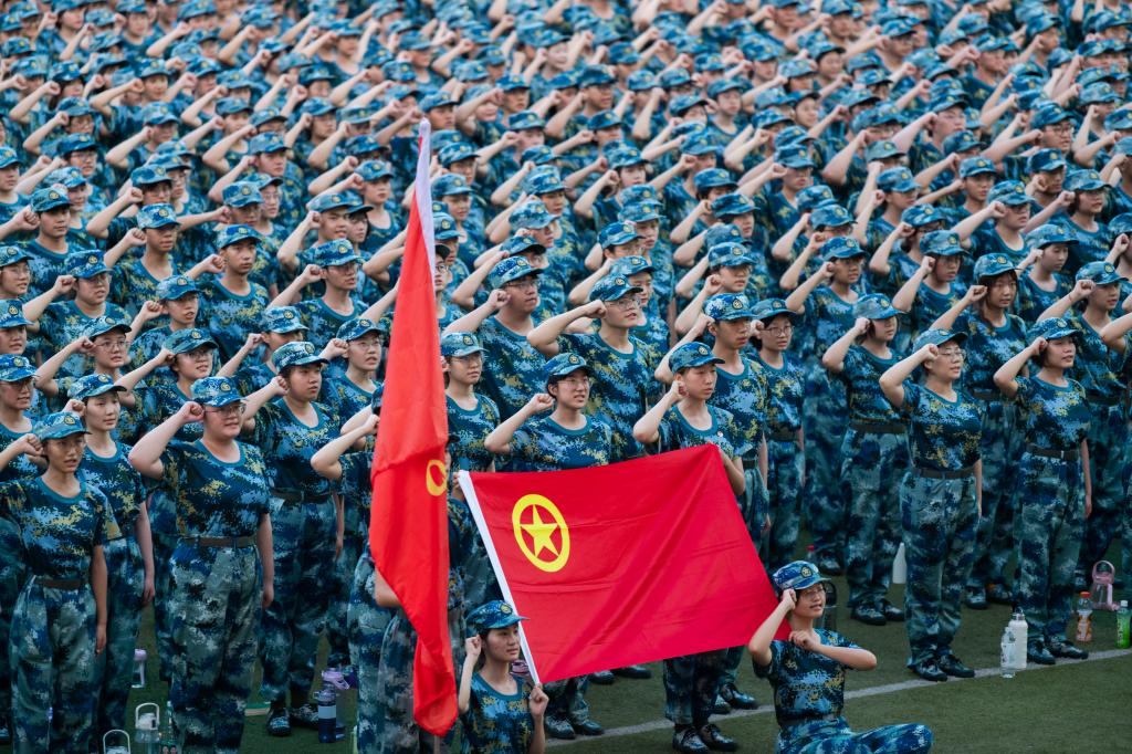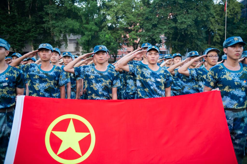 怀着崇敬的心情,各连队按照“CCNU”队形昂首挺立在佑铭操场,奏唱庄严的国歌。迷彩的衣裳和鲜红的旗帜交相辉映,同学们右手握拳诵读入团誓词,声音铿锵有力。《强军战歌》吹拂起内心的忠诚,面对多变复杂的外部环境,同学们坚定地宣读承诺书,为青春之我立青春之誓。