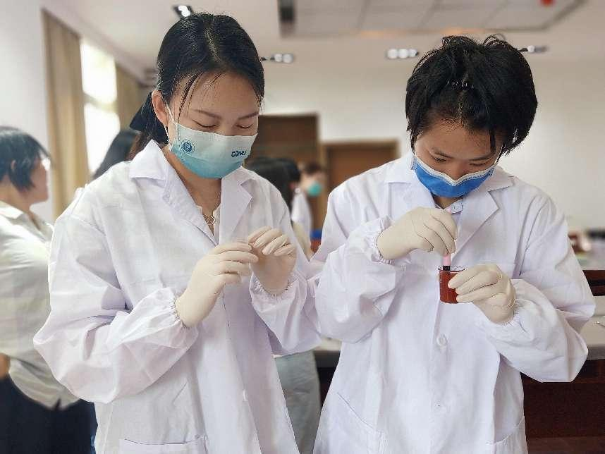 为确保每一位参与者都能制作出心仪的口红,现场安排了学生志愿者及时为老师们进行讲解、指导并提供帮助。