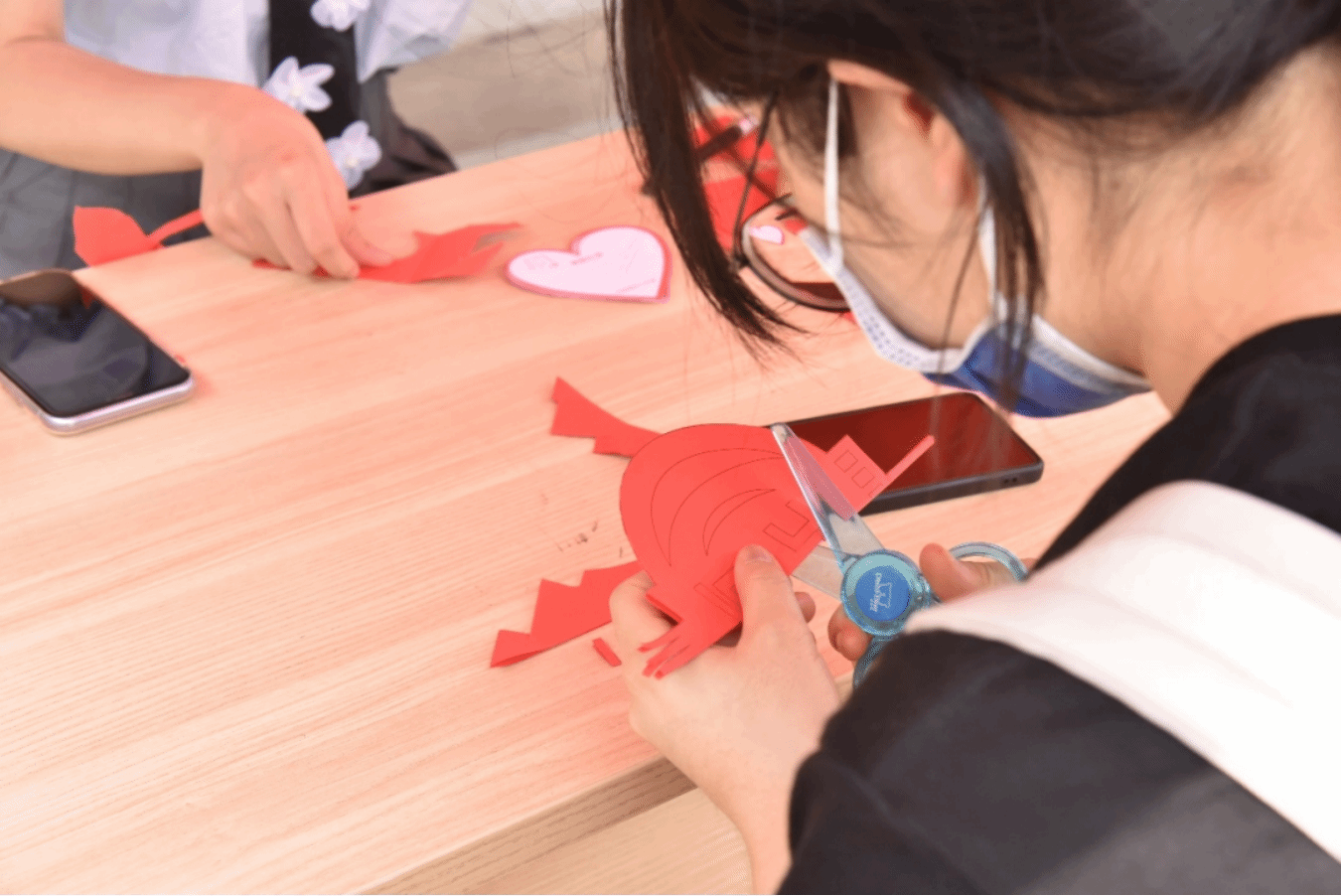 在剪纸体验站点,同学们拿起剪刀在彩纸上下纷飞,用天马行空的想象和灵巧的双手,折叠、裁剪出一个个栩栩如生的图案。大家相互解读和描述着各自剪纸的寓意,气氛十分欢乐。