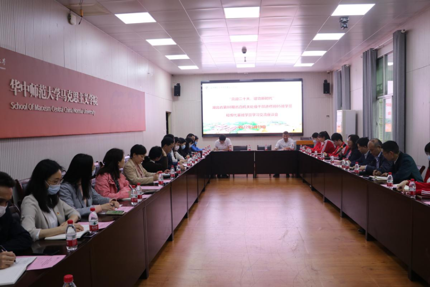 马克思主义学院讯(通讯员 伍轩 王海龙;摄影 许静)交流中碰撞思想火花,探讨中凝聚行动共识。5月19日下午,湖北省第88期省直机关处级干部进修班5班联合我院恽代英班,举办学习交流座谈会。学院党委书记孙永祥、院长万美容、党委副书记邵莉莉、副院长邵彦涛、19级本科生辅导员王海龙以及进修班5班全体成员、恽代英班学生代表共计40余人参加研讨交流。座谈会由邵莉莉主持。
