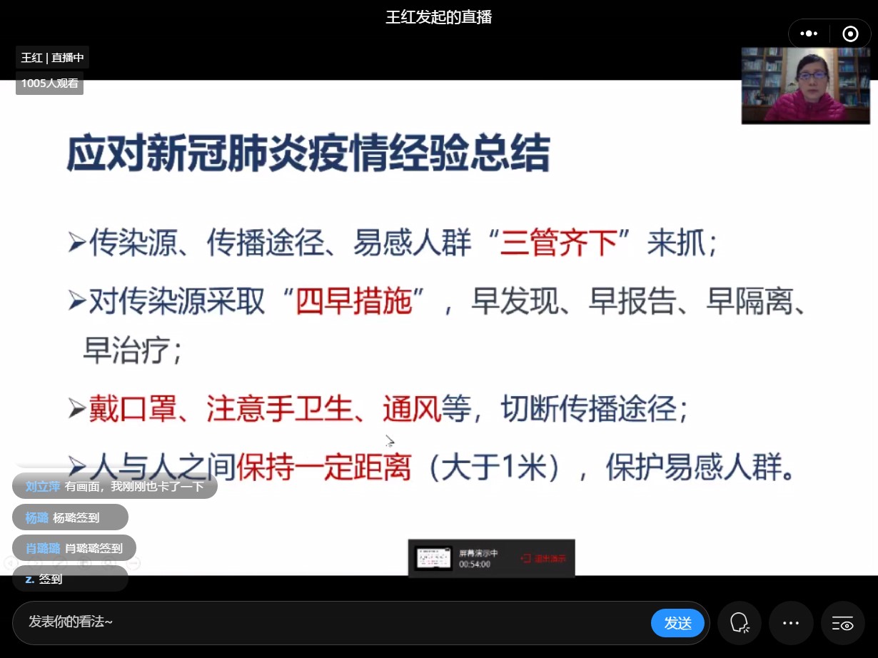 校医院副院长桂珂作为一名一直奋战在抗疫一线的医护人员,用“感恩、感动、科学”三个关键词与同学们分享了两个多月的工作经历和感想。桂院长表示,在此次疫情阻击战中,国家对于人民的健康和生命高度重视,各地驰援武汉、华师校友及对口支援单位踊跃向学校捐赠防护物资和生活物资、华师人共克时艰守护校园等等很多感人的事迹让这个冬天也充满了温暖。希望同学科学防控,不信谣不传谣,树立信心,为接下来的复学做好充分准备。