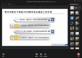 美术学院党委副书记李宪玲首先汇报了学院2020届毕业生就业工作方案和就业工作总体情况。结合学院实际,她详细介绍了推进就业工作的两大工程,即就业工作“一把手工程”和“人人工程”,提出了推进就业工作的“四个工作机制”,即全过程就业联动机制、全方位就业保障机制、网格化就业服务机制、全员化就业激励机制。然后针对疫情时期就业工作新问题、新特点从“把脉问诊”、“组合开方”、“对症施策”、“提质增效”四个方面对学院当前就业工作开展情况进行了详细介绍。李书记指出,学生高质量的如期毕业和就业是学院在抗击疫情之下需要打赢的另一场战疫,在疫情的大考中胜出,需要全院师生的智慧和力量,主动出击,整合资源。