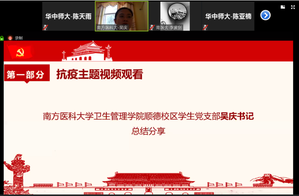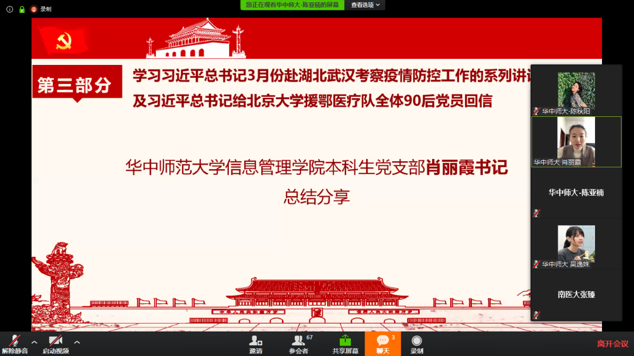 3月25日上午九点,中共华中师范大学信息管理学院本科生党支部三月联合线上主题党日活动顺利开展。本次党日活动与南方医科大学卫生管理学院顺德校区学生党支部和校本部第二学生党支部联合开展。南方医科大学卫生管理学院顺德校区学生党支部书记吴庆、校本部第二党支部书记王益涛和我校信息管理学院本科生党支部书记肖丽霞共同策划并参加此次活动,活动由双方党支部党员陈亚楠同志和李紫剑同志主持。