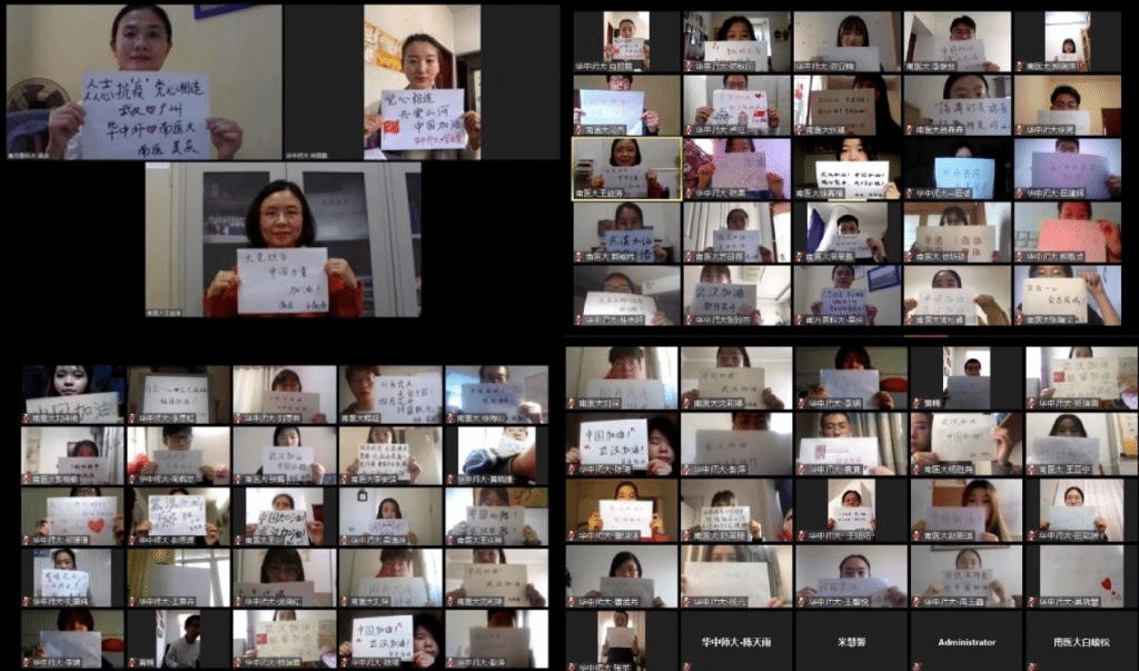 同气连枝,众志成城,活动最后,全体与会党员通过展示祝福语的方式表达了对祖国的深切祝福,本次线上联合党日活动取得圆满成功。希望党员同志们谨记“祖国如有难,汝应作前锋”的嘱托,期待疫情散去,能相约桂子山,同游珠江水畔!