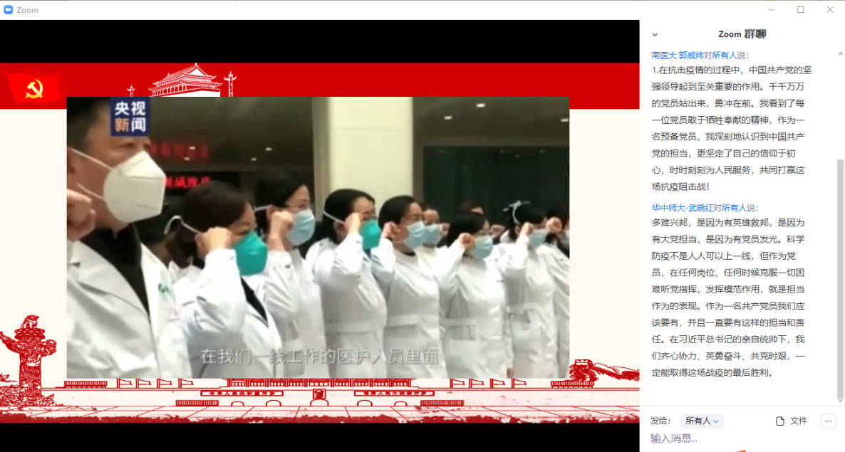 在学习习近平总书记赴武汉考察疫情防控工作的系列讲话精神,以及“习近平总书记给北京大学援鄂医疗队全体90后党员回信”的过程中,与会党员同志在聊天区中积极发表学习心得。我院本科生党支部吴逸姝同志分享到,昨天父母眼中的孩子,今天已经成为新时代国家的脊梁,大学生党员在以实际行动抗击疫情,贡献青春力量。随后,肖丽霞书记总结中谈到,作为湖北人民的一员,真诚感谢以南方医科大学各附属医院为代表的来自全国各地的援鄂医疗团队、人民子弟兵、社区工作者、民警干部、志愿者等等,本次疫情让人民看到了青年党员奋勇向前、舍生忘死的光辉,习近平总书记给北大“90”后援鄂医疗队的回信中,字里行间表达了对青年党员的肯定与期盼,青年一代具备了接好接力棒的担当与本领。我们也相信,在中国共产党的领导下,能让世界人民再一次看到中国人民的万众一心,和不可撼动的中国力量!