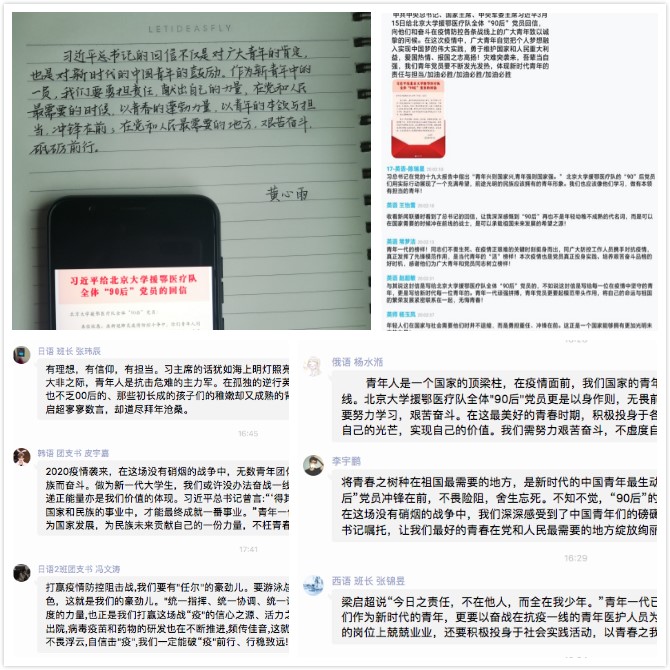 3月18日以来,外国语学院全体青年教师、学生党员以及广大青年学生通过学习强国、QQ群、企业微信等平台开展习近平总书记给北京大学援鄂医疗队“90后”党员的回信的学习与交流。青年教师以及同学们在线上展开热烈讨论与交流,广大青年深受鼓舞、备受感动。