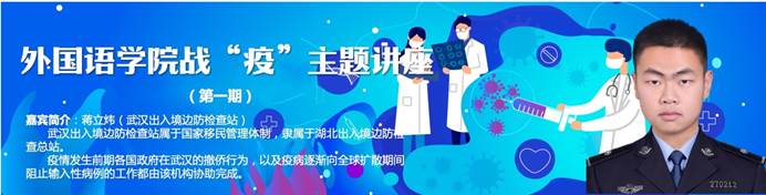 近日,外国语学院2018级英语系开展的“全民战疫”主题系列微讲座第一期在线上开讲。此次讲座邀请了学院2015届院友,武汉出入境边防检查站勤务指挥中心蒋立炜警官担任讲座嘉宾。