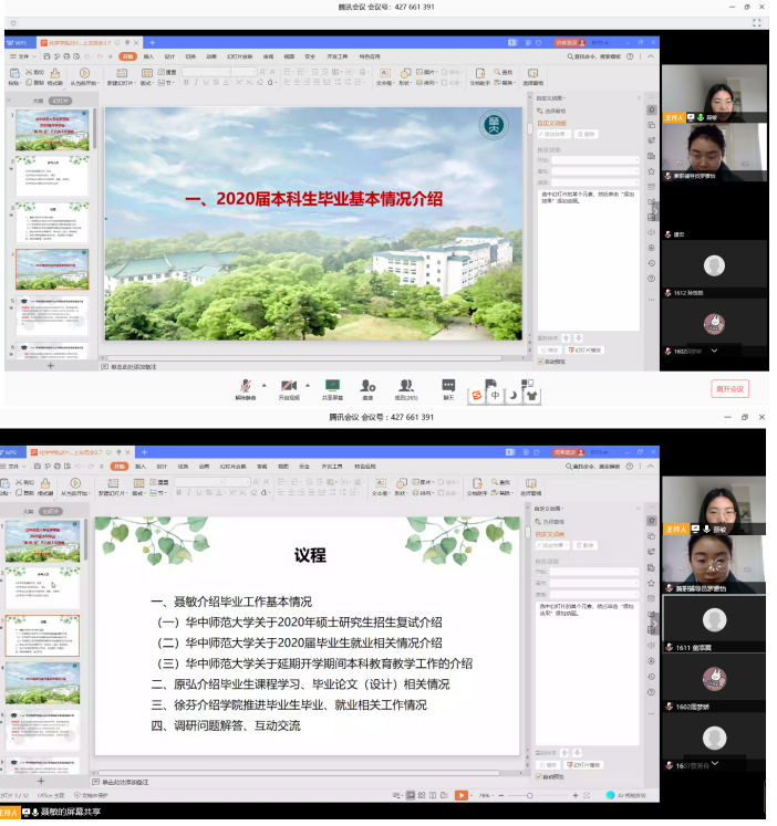 首先,聂敏就我校2020届本科毕业生毕业就业情况进行了详细介绍,帮助毕业生了解目前毕业就业形势和年级毕业就业现状,解答关于疫情防控期间毕业就业相关问题的困惑。第一,华中师范大学2020年硕士研究生招生复试相关介绍。通过从年级相关考研情况、成绩复查、成绩排名、调剂、统招名额、复试线及复试相关、招生咨询等七个方面将学校有关考研复试政策和咨询通道提供给学生,强调疫情影响是暂时的,鼓励学生安心在家准备复试相关事宜。第二,华中师范大学关于2020届毕业生就业相关情况介绍。从校园招聘空中双选会、就业手续办理、就业指导与咨询、就业咨询联系方式等四个方面系统介绍了就业相关事宜,保障线上就业工作的平稳进行。第三,华中师范大学关于延期开学期间本科教育教学工作的介绍。介绍了思想政治素质课程、学籍证明办理、新冠肺炎疫情专项困难补助、网上学习流量补助、保险理赔、心理咨询、校医院心理门诊就诊和开药、医生联系方式、学习实践、矫正教育、校内外辅修、成绩管理、加退课、在线学习平台稳定性等十四项问题,详细传达了学校关于延期开学教育教学相关工作的政策,为毕业生正常学习生活提供了资源和平台,努力将疫情影响降到最低。