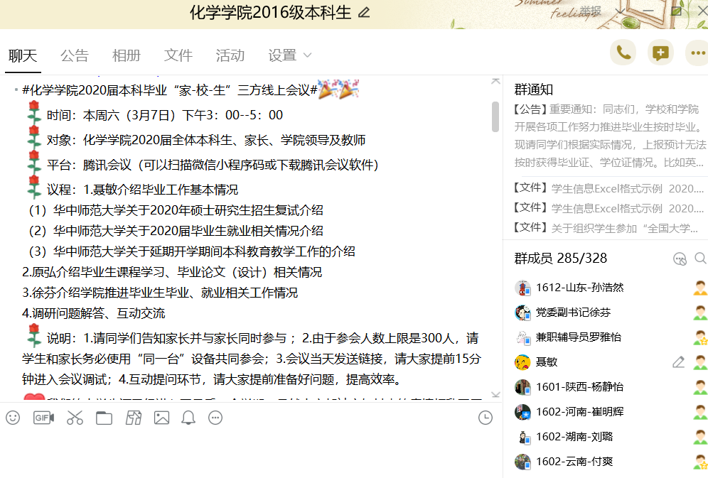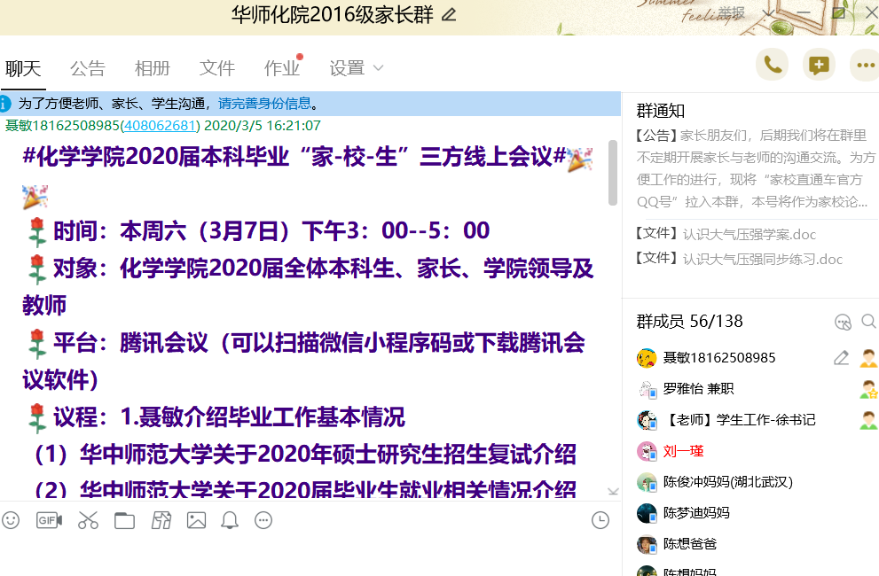 3月7日下午,化学学院2020届本科毕业“家-校-生”线上交流会在腾讯会议平台召开,就疫情防控下学生毕业、就业相关问题和工作开展深入交流。化学学院党委副书记徐芬、教学负责人原弘、辅导员聂敏、罗雅怡,以及2020届全体本科生和家长参与了会议,参与人数近600人(学生和家长共用一台设备)。会议由聂敏主持。